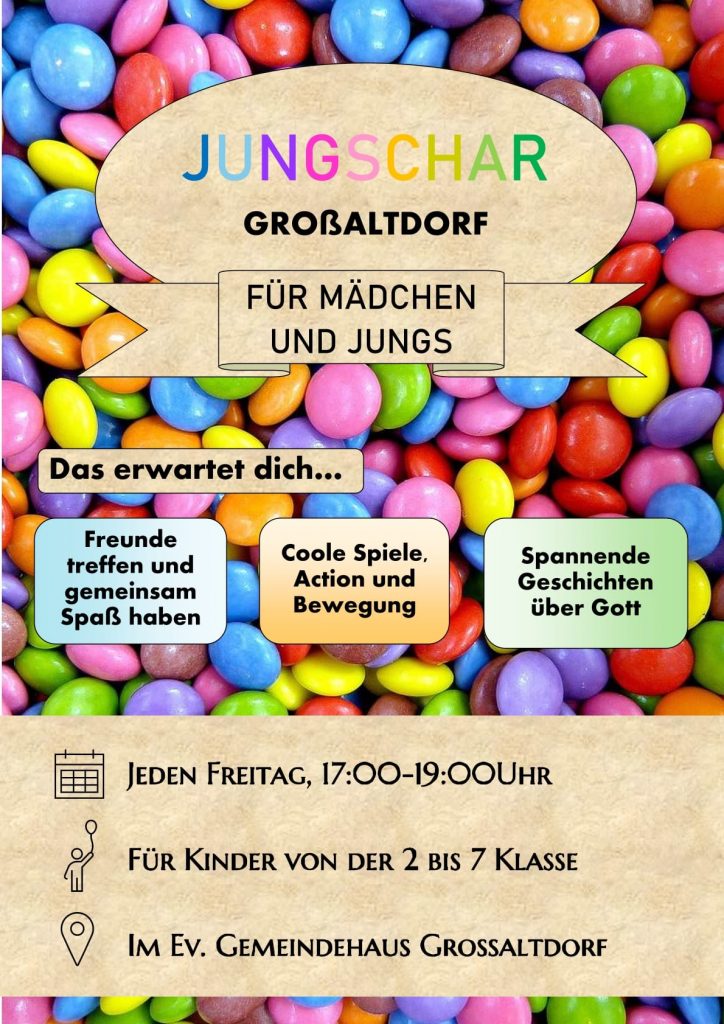 Jungschar Großaltdorf Freitags, 17h im Gemeindehaus (ab 2. Klasse) + Zu Google Kalender hinzufügen + iCal / Outlook export 00 Tage 00 Stunden 00 Minuten 00 Sekunden Datum 31 Okt 2025 Uhrzeit 17:00 - 18:30 Veranstaltungsort Gemeindehaus Großaltdorf August-Halm-Straße 2, 74541 Vellberg Website https://www.kirche-grossaltdorf.de/ Kategorie Jungschar Teile diese Veranstaltung