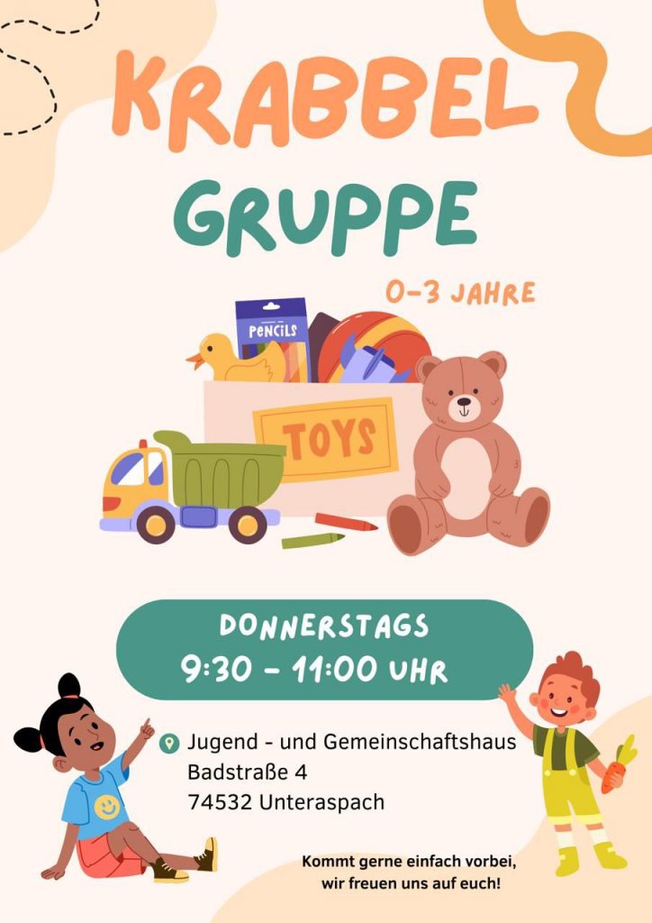 Krabbelgruppe Unteraspach Auch in den Ferien, aber nicht an Feiertagen! + Zu Google Kalender hinzufügen + iCal / Outlook export 00 Tage 00 Stunden 00 Minuten 00 Sekunden Schlagwörter: Kinder, Krabbelgruppe Datum 19 März 2026 Uhrzeit 09:30 - 11:00 Veranstaltungsort Gemeinschaftshaus Unteraspach Badstr. 4 74532 Ilshofen Teile diese Veranstaltung